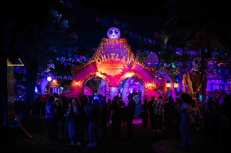 El recorrido continúa con experiencias más sensoriales como “El Limbo”, donde los visitantes podrán pintarse el rostro o las manos con colores neón y disfrutar bebidas brillantes; “El Inframundo”, un viaje simbólico al Mictlán lleno de luces, sonidos y atmósferas ancestrales; y “El Omitlán”, una aldea espeluznante con casas de huesos, una resbaladilla gigante y una alberca de pelotas que invita a sacar al niño interior.